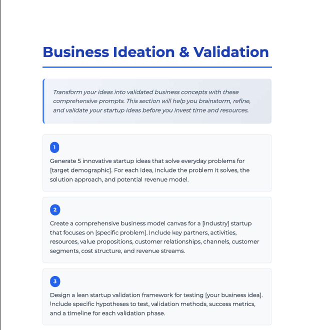 This isn’t generic fluff — every prompt is designed to give you actionable outputs from AI tools like ChatGPT that directly apply to your startup journey. Think of it as your personal AI co-founder, guiding you from idea to execution.
